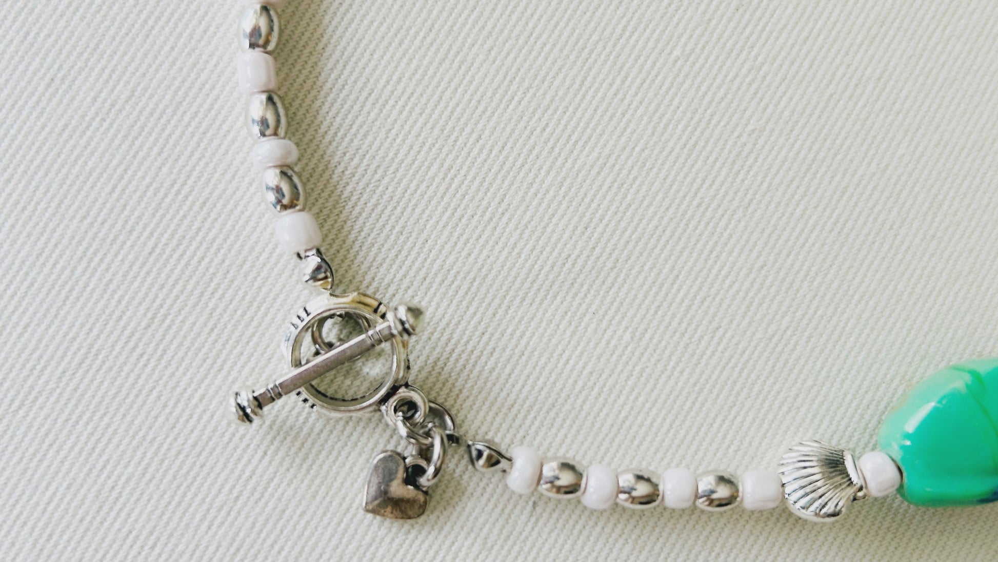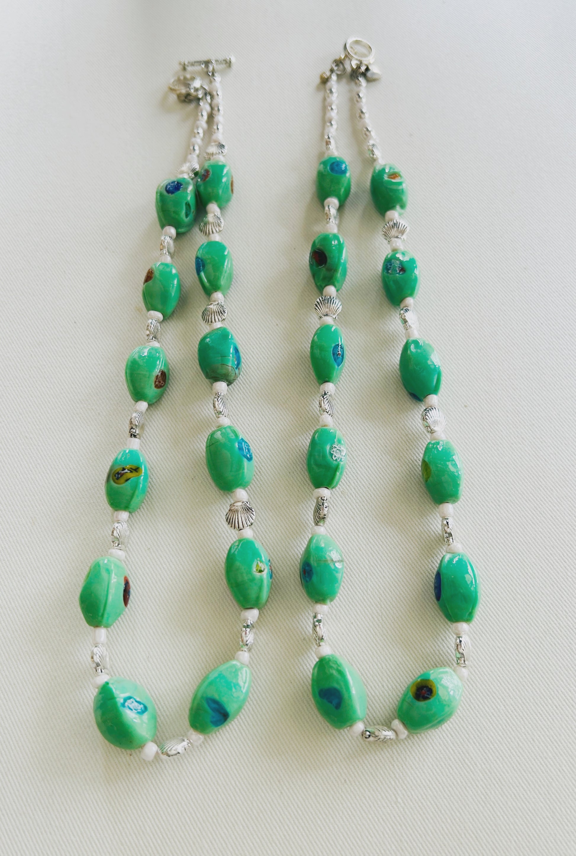 Cuentas de cerámica color verde agua (compradas en Atenas), mostacillas perladas blancas y cuentas de pewter en forma de caracolas de mar.