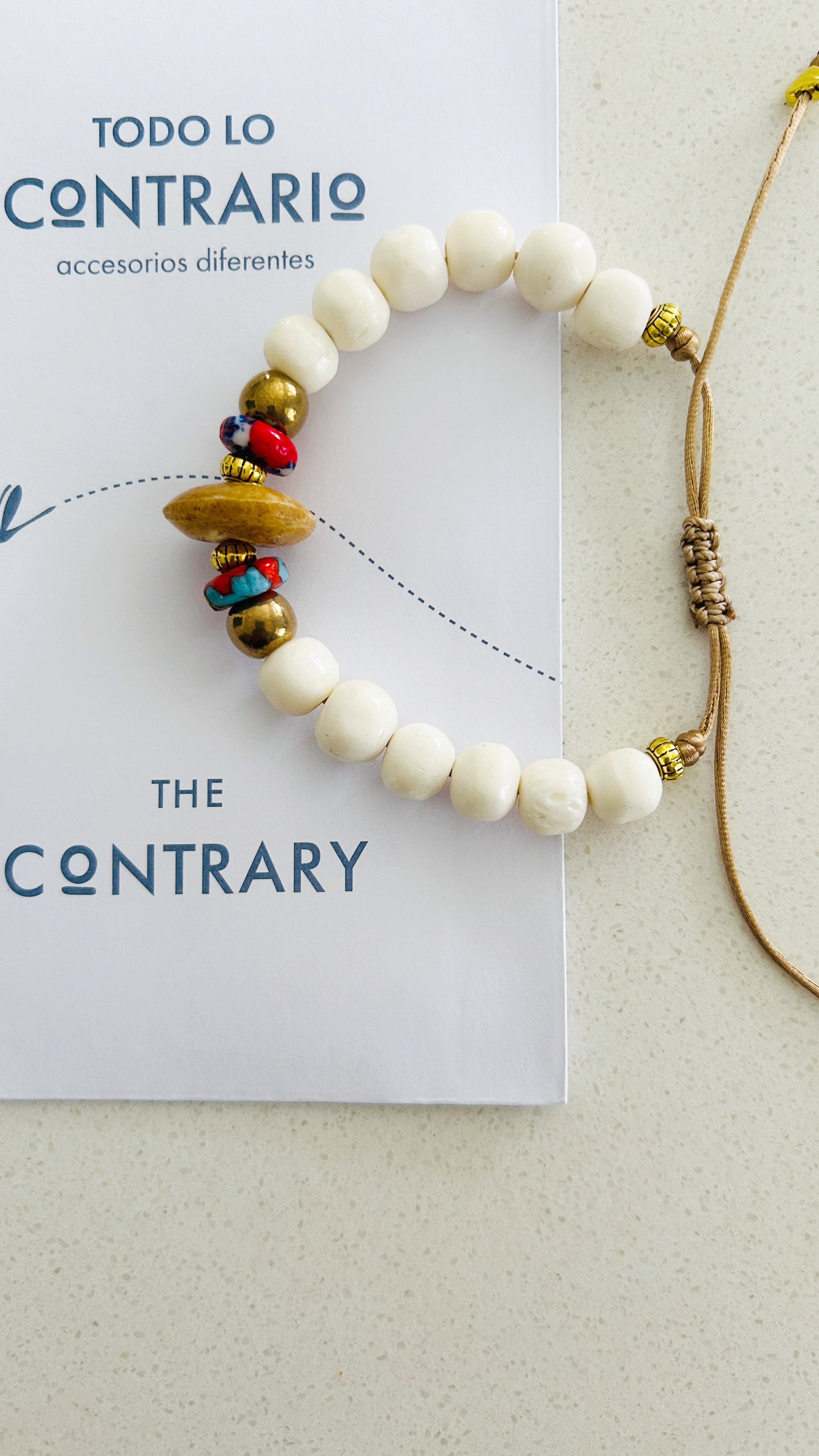 Cuentas de hueso, cuentas krobo planas (vidrio reciclado de Ghana), cuentas de brass.
